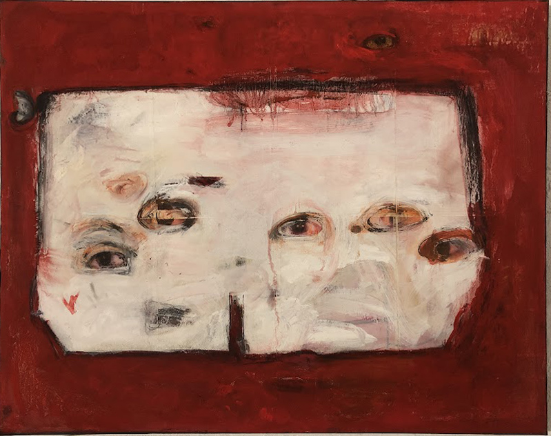 brüchige Farbflächen können von zum Teil schroff gesetzten dunklen Lineaturen umrissen sein. Das erzeugt eine Art Körperpanzer, der Schutz vor dem bedrohlichen Draußen verspricht und zugleich einegewisse Isolation und Regungslosigkeit einfordert.