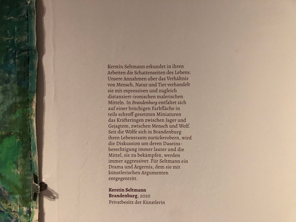 …Seitdem erkundet sie mittels der Malerei und der Zeichnung die energetisch aufgeladenen Schattenseiten des Lebens. Introvertiert und zugleich expressiv werden unsere Bildvorstellungen von Mensch, Natur und Getier – die nicht