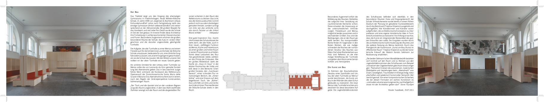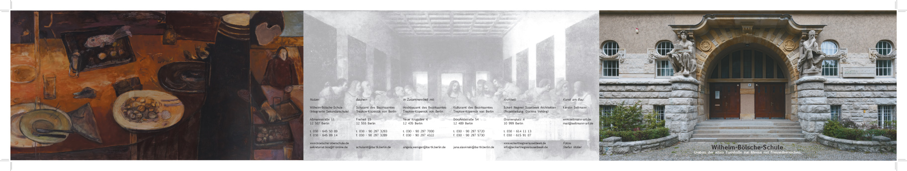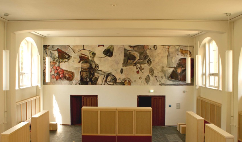 | Wilhelm-Bölsche-Schule Berlin Friedrichshagen realisiert: Oktober/ November 2010 Textauszug aus: Neue Kunst für Friedrichshagener Schulen – Eine Umstandsbeschreibung Doris Thyrolph/ Petra Hornung „Die Renovierungsarbeiten der neuen Mensa waren noch nicht ganz abgeschlossen, aber die Wandbilder thronten sozusagen in vollendetem Zustand – wie gütige Zaubermajestäten- über dem neuen Raumensemble. Ohne jede Herrschergebärde, aber so, als ob sie schon immer da Daheim wären; in dieser Mischung aus Präsenz, Geheimnis und leicht anklingendem Humor; so, wie eine schöne eingebungsvolle musikalische Weise. Das Licht, das mildtätig durch die neuen Fenster trat, tat ein Übriges.Sie war spürbar, die Energie guter Kunst, die unabhängig von Mode und Trend, Jahrtausende schon ihren Wert vermitteln konnte. Und sie war spürbar, die Faszination, die immer dann entsteht, wenn Architektur und Kunst zusammen spielen und ein Klang entsteht, der die Kräfte ausbalancieren lässt und eben nicht in Hierarchien zwingt.So konnte sich der Raum durch den Konsens von Sinnlichkeit und Funktion prägen, ohne dass das Feld der Kunst ausschließlich das Ästhetische und die Architektur allein den Gebrauchswert im Sinne hatten. Im Grunde ist eine entzückend gestaltete Tasse, aus der man schlecht trinken kann, ebenso unerfreulich, wie ein Bild, das den Raum erschlägt oder ein Stuhl auf dem man zwar man zwar Platz nimmt aber nur weil man nicht mehr stehen kann…Die Dinge funktionieren immer am besten, wenn sie praktisch und schön sind, und das, weil Schönheit eben auch eine absolute Funktion ist. Die beiden Seltmannschen Wandbildentwürfe beziehen sich also konkret auf den Raum und zu Motiven aus den Jugendstildekorationen des Schulhauses zum Beispiel und setzen den Gegebenheiten gleichsam etwas entgegen.Thematisch kreisen die assoziativen, malerischen Bildobjekte und –beziehungen beim ´Abendmahl´, ums Essen, Geselligkeit, Traumwelten in hintergründig, metapherhaften und spielerisch humorvoller Semantik. Meisterlich gemalt. Von einer kompositorischen Sicherheit, die bei diesen Formaten – ein wahres Kunststück ist. (körperlich und gestalterisch)Als eine ´Gedankenmaschine´ versteht sich das zweite Wandbild, das sich ´vis-á-vis´ befindet und sozusagen eine „Zeitreise inmitten von Trauben, Fisch und Huhn“ (Martin Schönfeld, bbkberlin) entwickelt. Für Rezipienten kann das ein Spiel mit den eigenen Vergewisserungen und Fragen sein.Auf der Suche nach Antworten bekommen Sie in den Bildern von Kerstin Seltmann entweder eine Frage präsentiert oder eine Einladung sich in die Facetten der geistigen Reflexion zu begeben, die solche Kunst nahelegt. Denn nichts ist schwarz oder weiß, gut oder böse, richtig oder falsch!Eine Harmonie vom Schlage Seltmann kommt nie ohne den Reiz der Dissonanzen aus, die gegen den Stachel löcken und doch die Schönheit hochhalten. Das ist was Gutes, nicht nur für Schülerinnen und Schüler!“ | ||